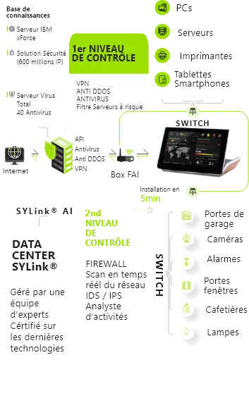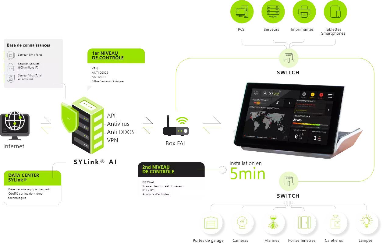 SYLink Box combine toute la puissance d'un IDS / NIDS / IPS / Sonde / Firewall et de connexion VPN externe pour renforcer la sécurité de votre réseau sur l'ensemble de vos périphériques et objets connectés.