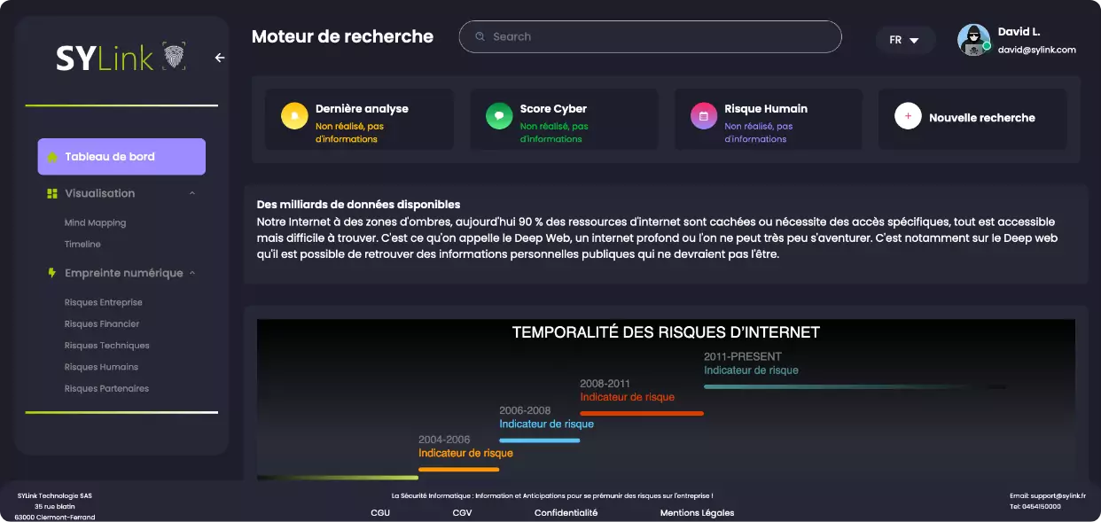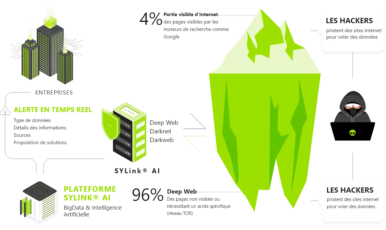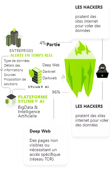 SYLink® Leaks est une plateforme intelligente capable de surveiller de manière exhaustive les fuites de données sur toutes les couches du web (dont les 96 % d'Internet nommés le deep web), y compris les milliards d'appareils connectés à Internet existant en dehors de votre périmètre.