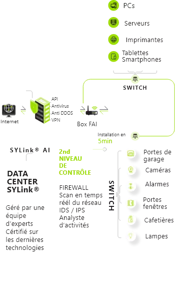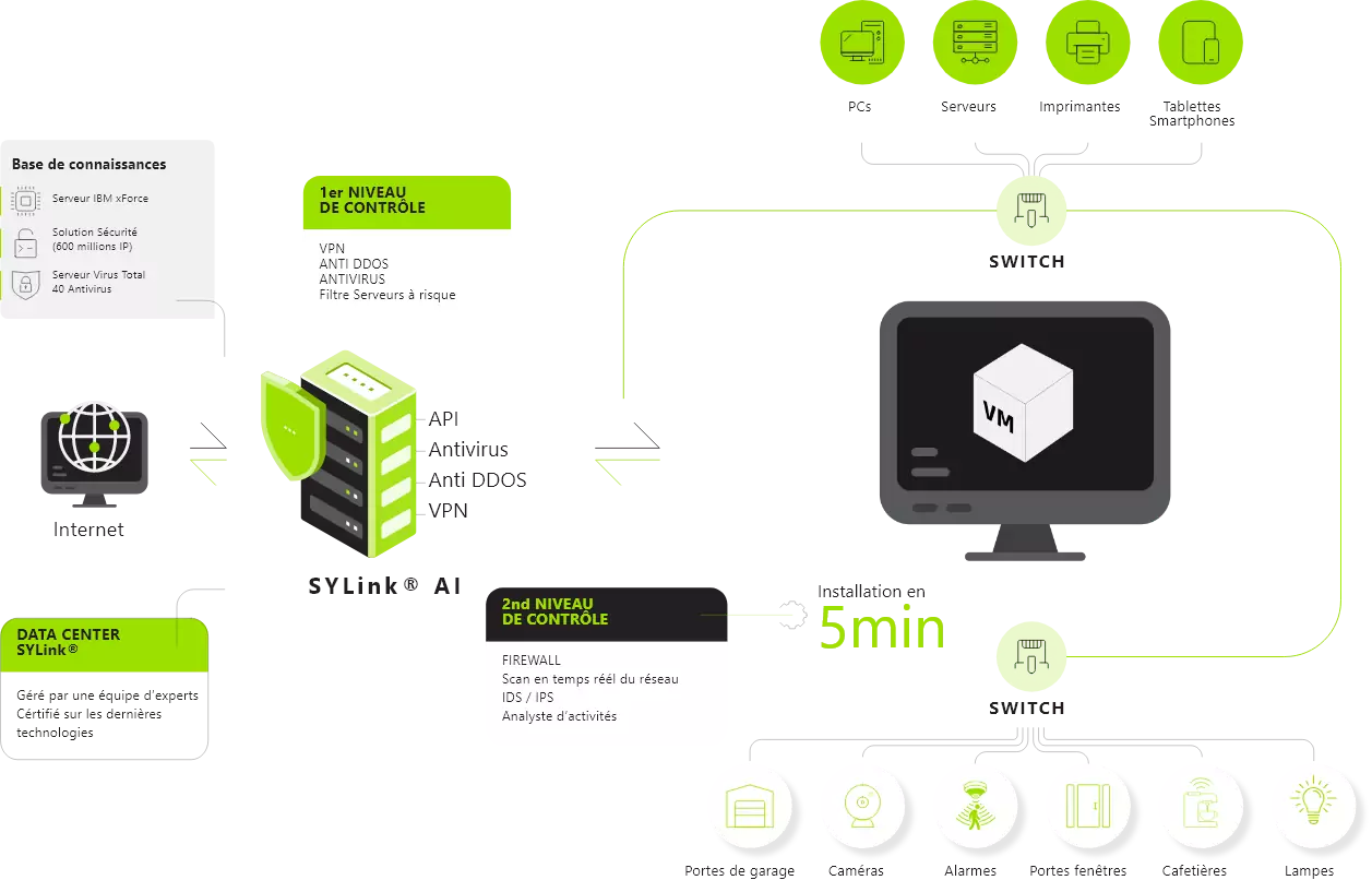 SYLink OP combine toute la puissance d'un IDS/NIDS/IPS/Sonde/Firewall et de connexion VPN externe pour renforcer la sécurité de votre réseau sur l'ensemble de vos périphériques et objets connectés.